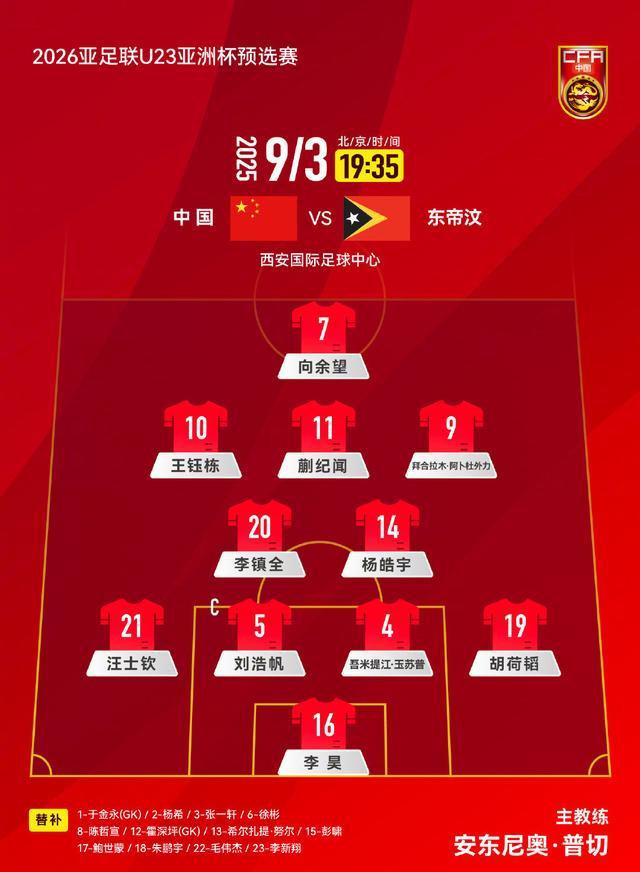 主教练安东尼奥-普切采用4231阵型,向余望单箭头突起、身后是王钰栋、蒯纪闻、拜合拉木,李镇全和杨皓宇坐镇中场,汪士钦、刘浩帆、吾米提江、胡荷韬组成四后卫,李昊担任首发门将。